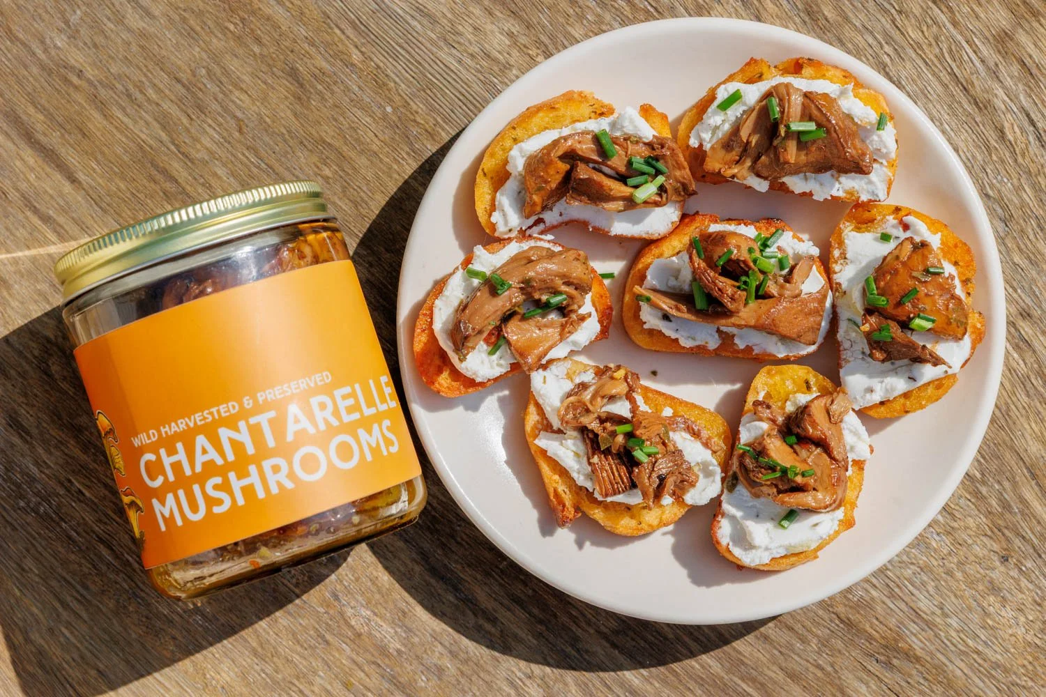 Some of the best appetizers come from clearing a shelf. This one starts with a jar — our wild-harvested chanterelles, preserved in Figure Ate Persimmon Vinegar with olive oil, chili flakes, and marjoram — and ends with something that looks like it came from a restaurant and takes about five minutes to assemble. Toasted bread, soft chèvre, mushrooms straight from the jar, fresh chives. That's it.